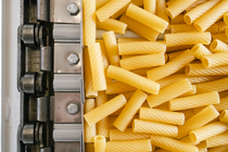 Nastro per essiccatoi di pasta corta realizzato con filati PEEK-PVDF per alte temperature e resistenza meccanica. Completo di giunzione rapida e rotelle detectabili.
